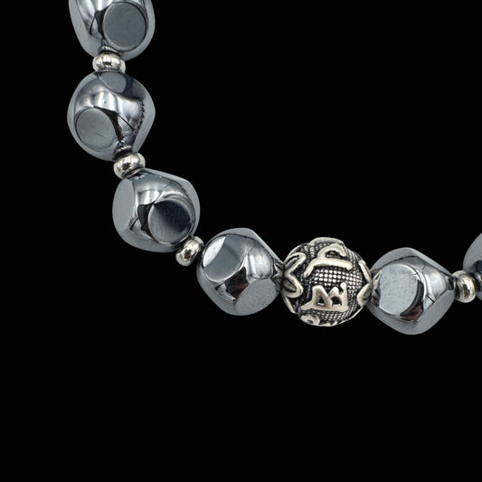 Brățară cu mantra Om Mani Padme Hum și cristale mari de Terahertz pentru protecție, claritate și echilibru mental