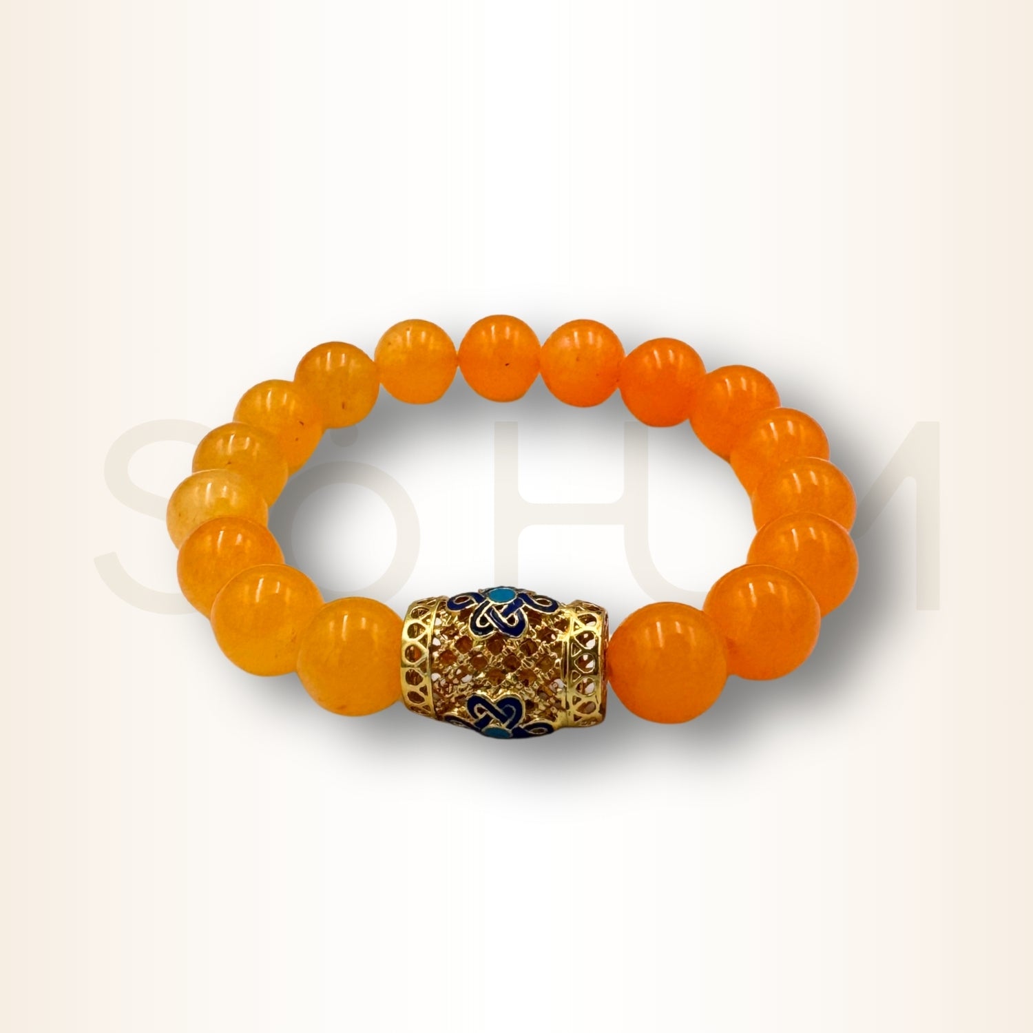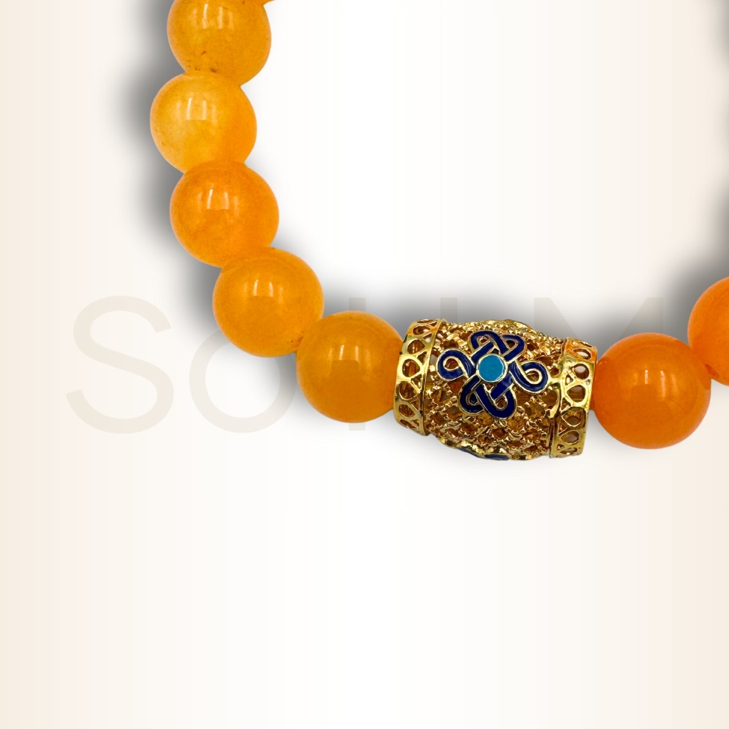 Materiale: jad natural pigmentat (nuanță portocalie), piesă decorativă metalică aurie cu nodul mistic
