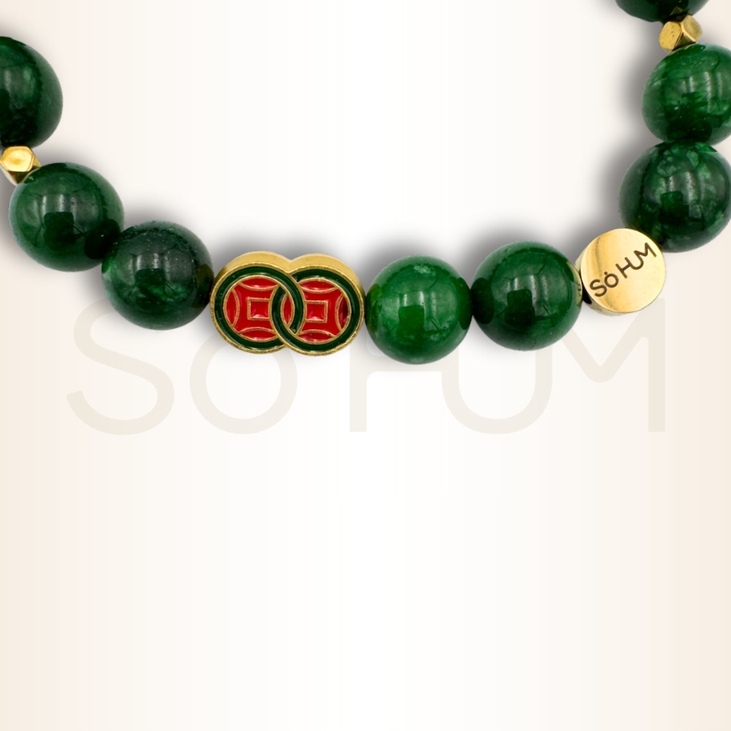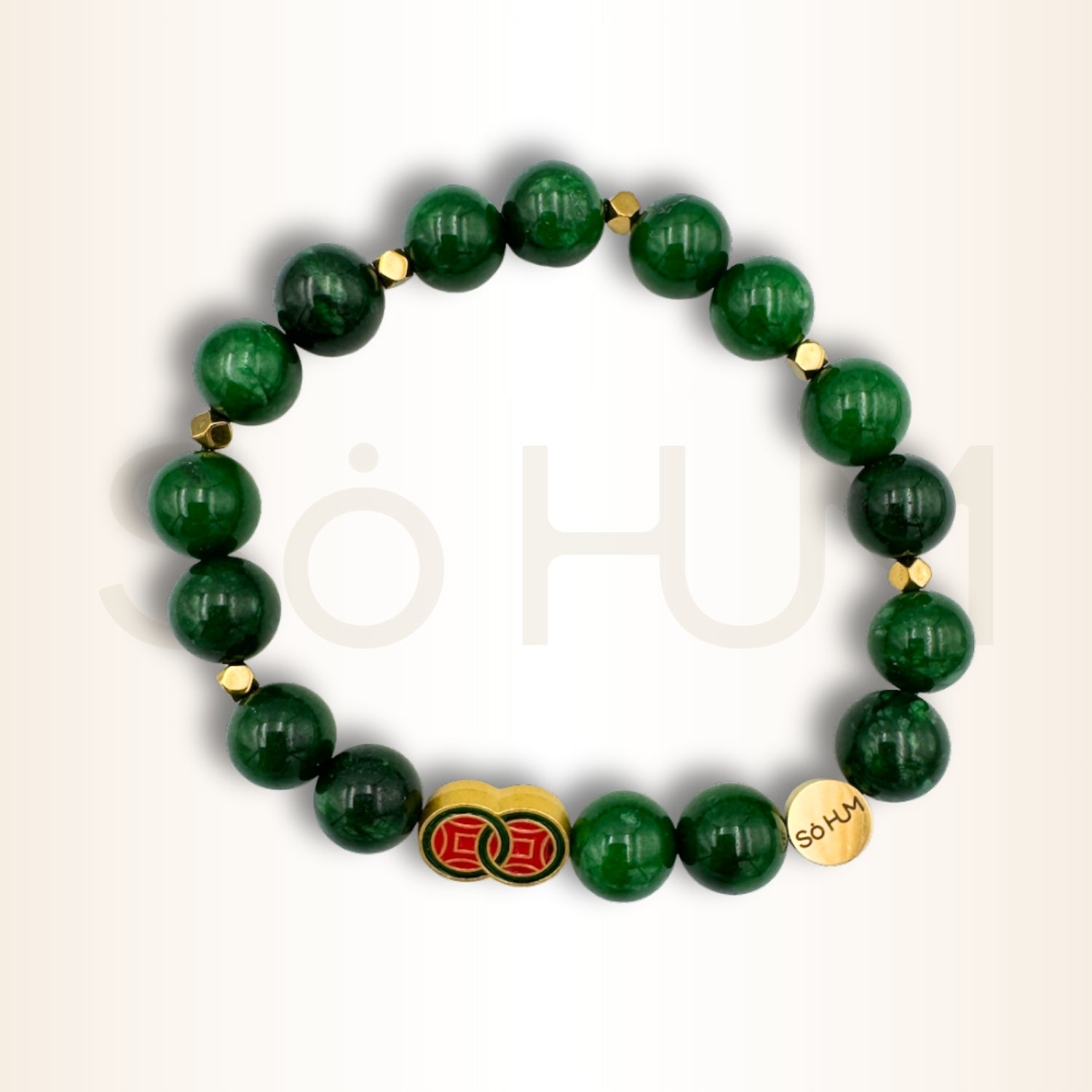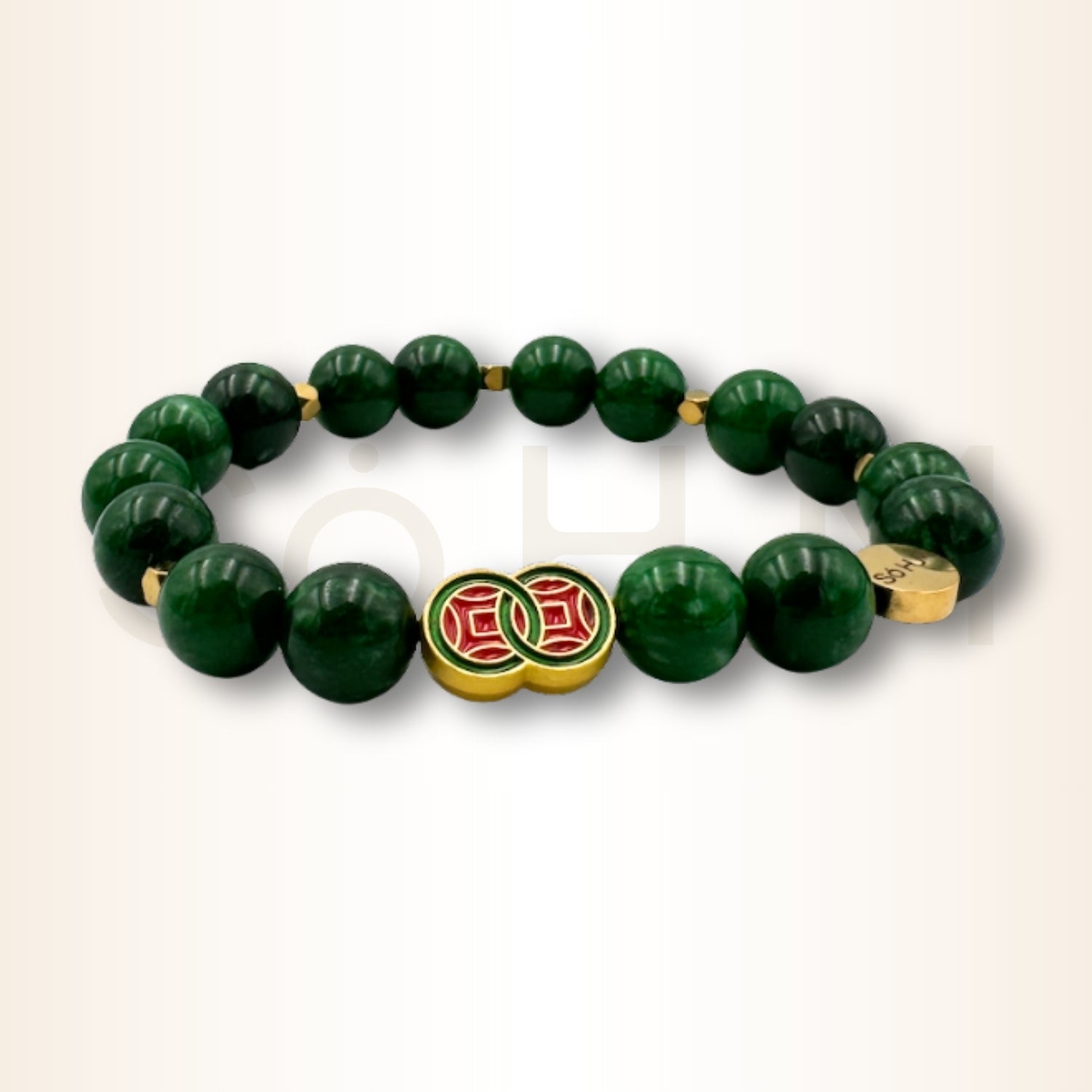Brățară cu Jad verde și simbolul banilor infiniți pentru bogăție nelimitată