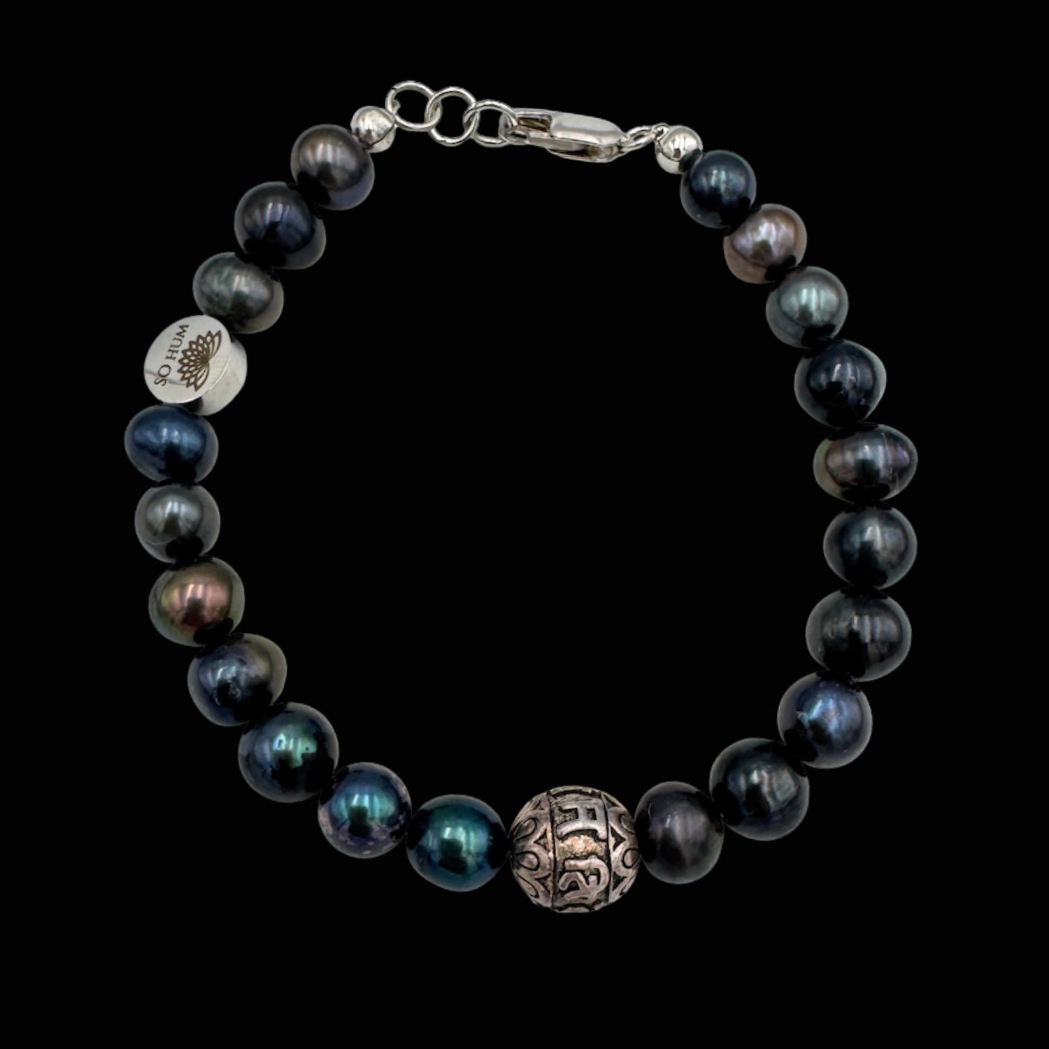 Brățară cu mantra Om Mani Padme Hum și Perle negre pentru protecție și compasiune