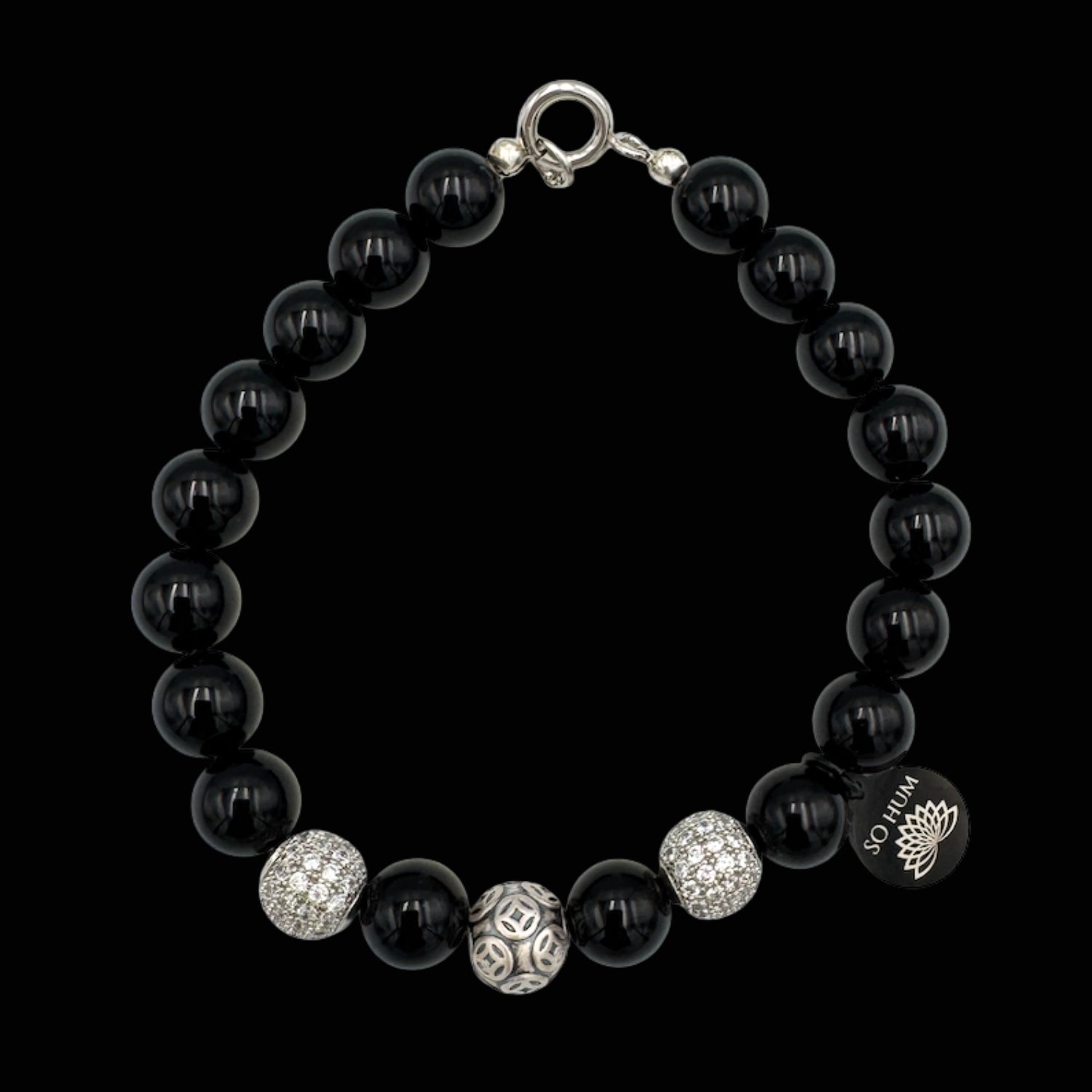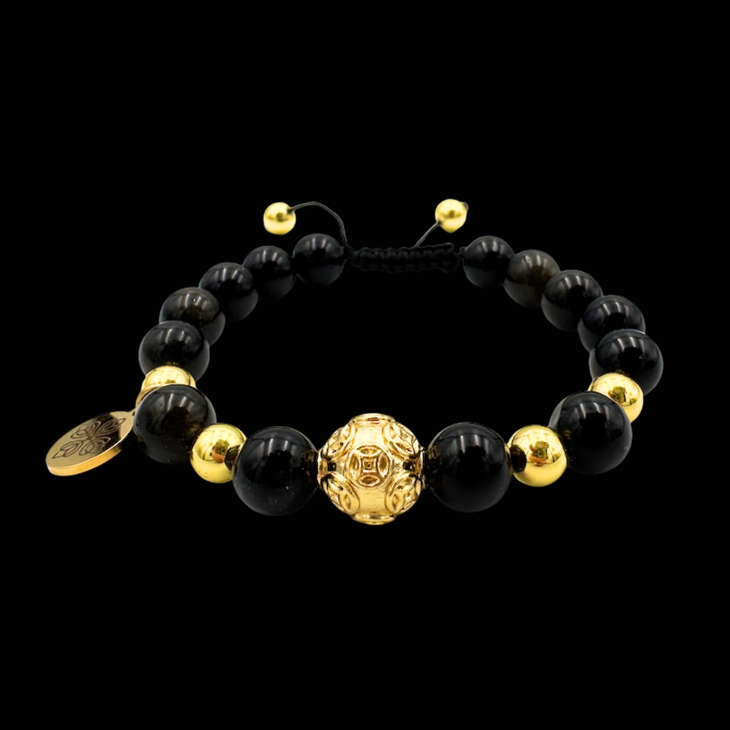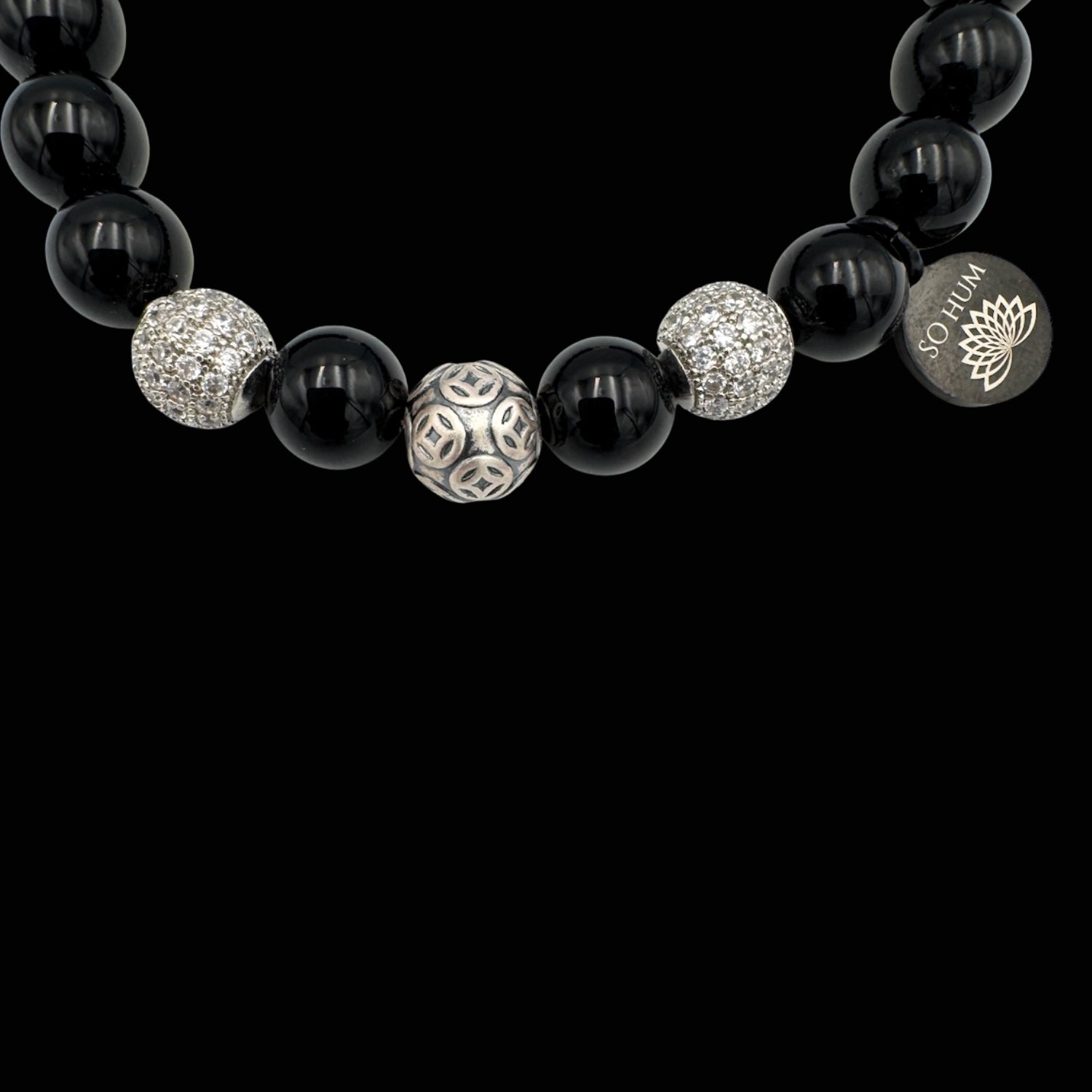 Această brățară îmbină două simboluri cu tradiție puternică în atragerea prosperității: monedele chinezești ale bogăției, considerate embleme ale succesului financiar de sute de ani, și Onixul, piatra care oferă stabilitate, protecție și determinare în atingerea obiectivelor materiale.