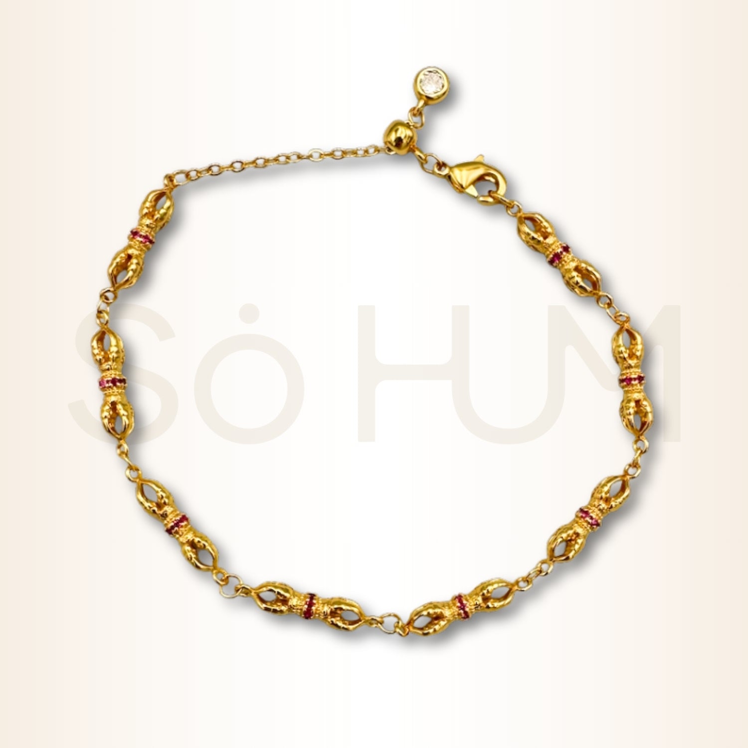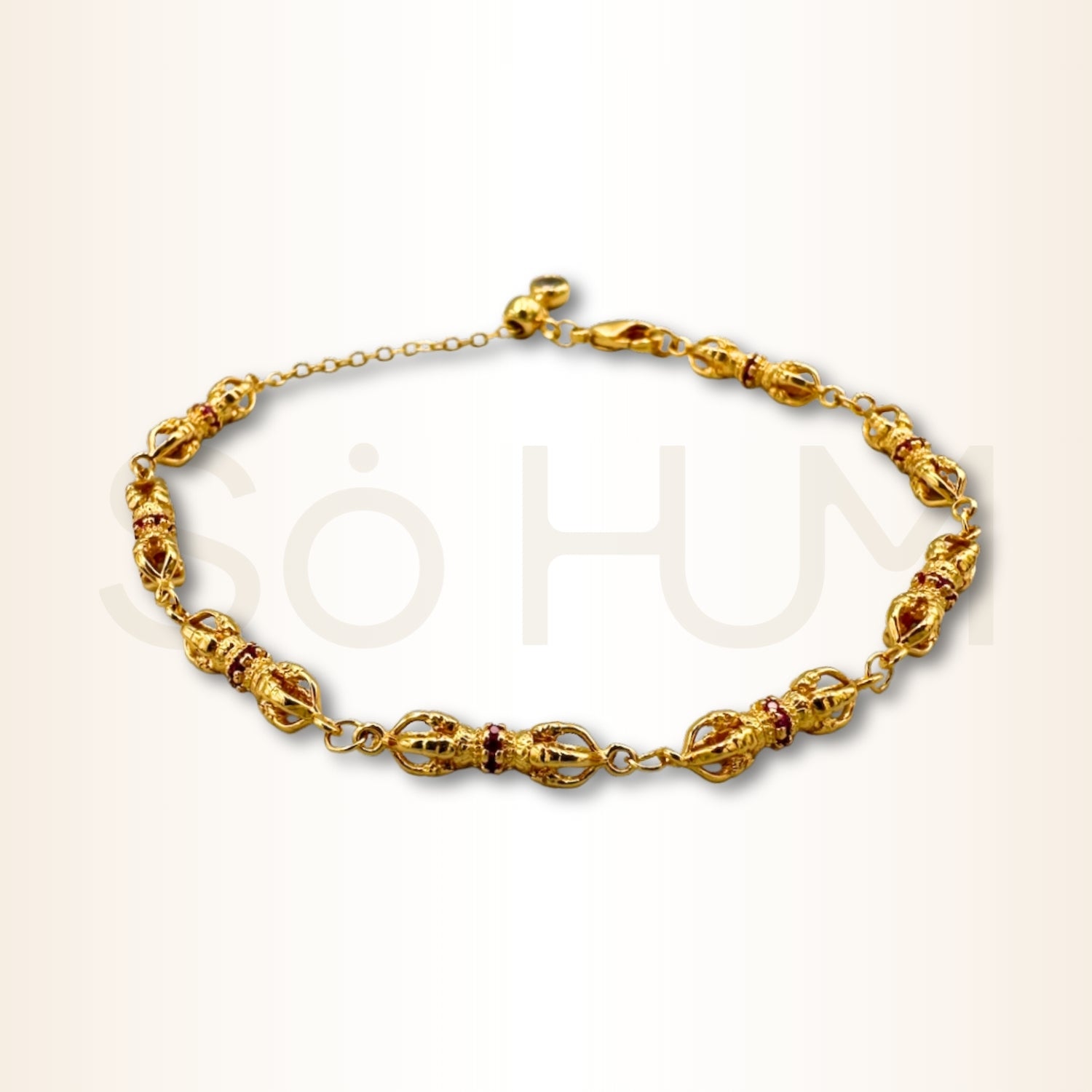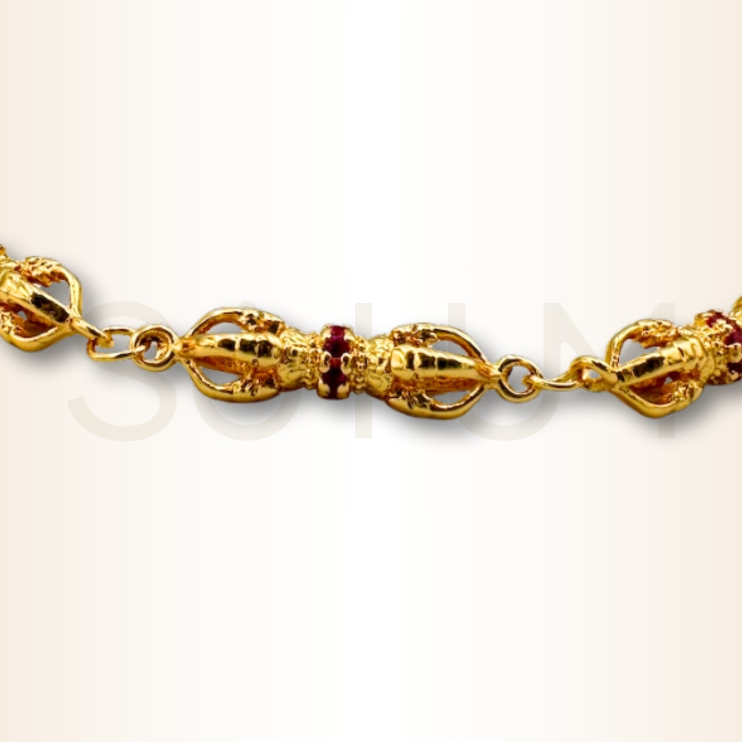 Modelul repetat de-a lungul brățării accentuează continuitatea protecției. Lanțul subțire creează un contrast discret cu modulele Vajra și oferă o senzație de fluiditate, potrivită pentru purtarea zilnică. Inserțiile colorate scot în evidență tema energizării personale și a orientării spre obiective.