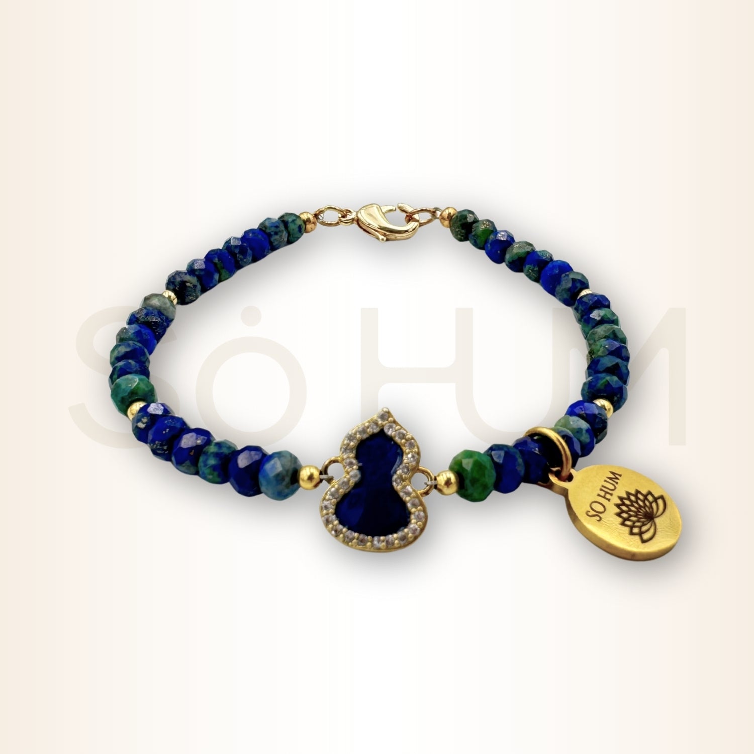 Această brățară reunește două simboluri extrem de puternice în protecția sănătății și purificarea energiilor: cristalul Azurit-Malachit, piatră a vindecării profunde, și Wu Lou, simbolul tradițional al longevității și al vitalității în Feng Shui.