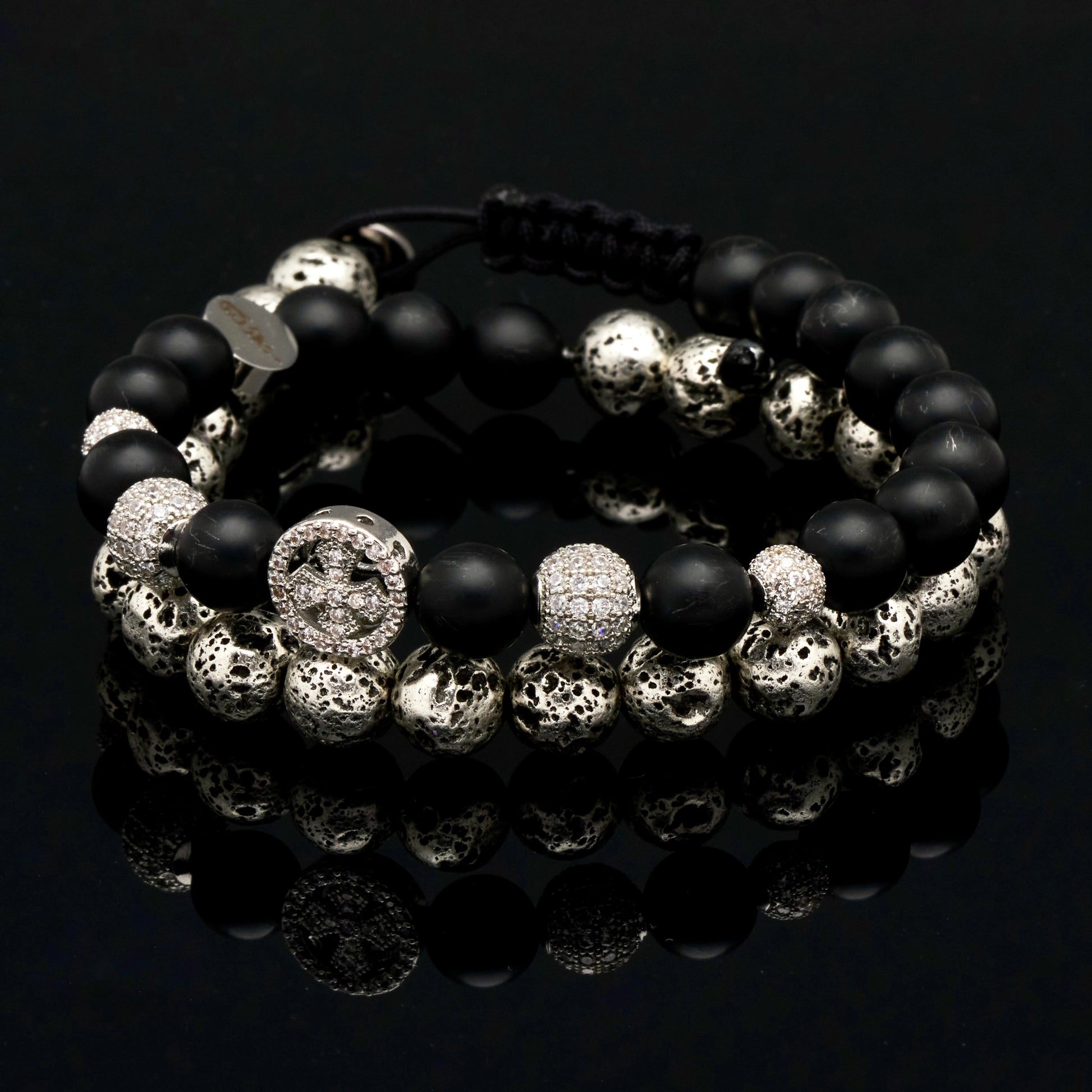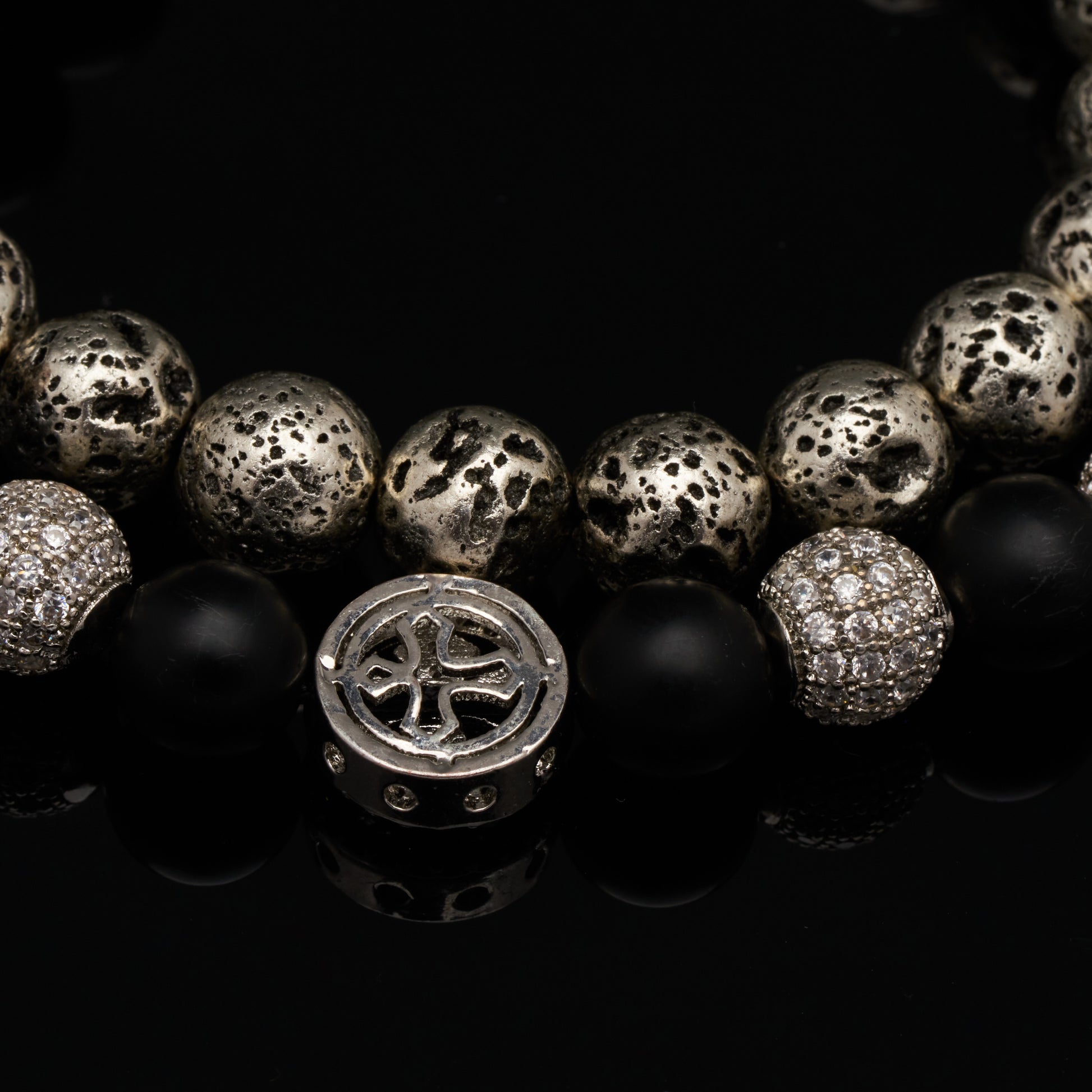 Brățară dublă cu Crucea Celtică, rocă vulcanică și cristale mate de Onix negru pentru putere personală