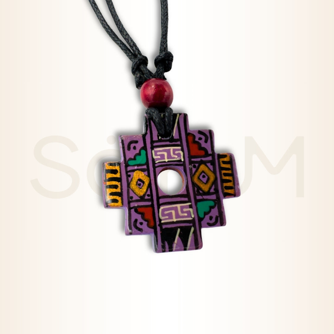 Modelul pictat manual al acestui colier combină movul profund cu detalii geometrice tradiționale. Movul este asociat în cultura andină cu viziunea interioară, sensibilitatea spirituală și accesul la niveluri superioare de conștiință. Elementele aurii amplifică ideea de lumină interioară, iar simbolurile geometrice reflectă căutarea unui fir coerent printre experiențele personale.