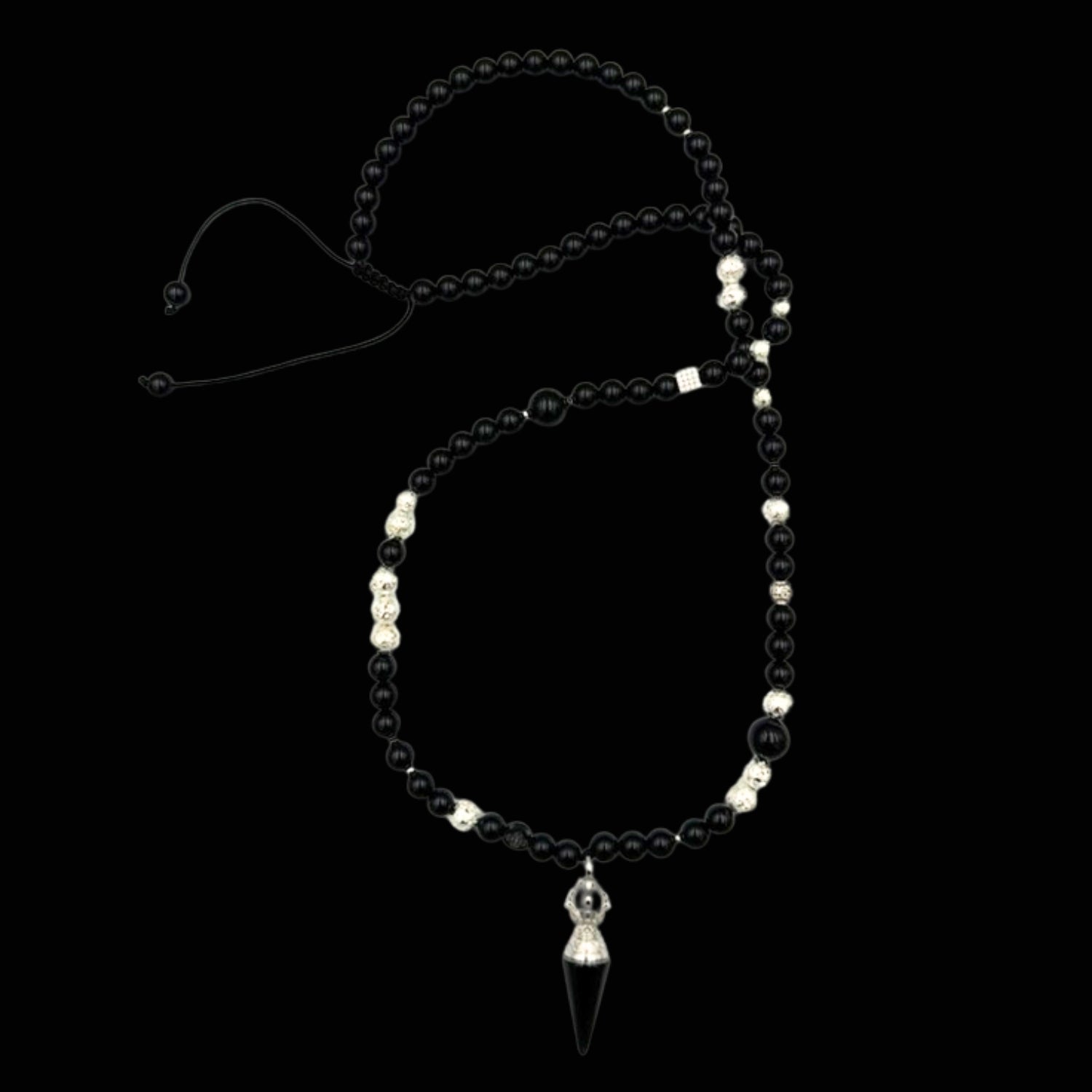 Acest colier reunește un simbol cu tradiție profundă în culturile himalayene, Vajra–Phurba, cu două dintre cele mai puternice materiale naturale pentru protecție și stabilitate: Onixul și Roca vulcanică. Împreună formează un talisman potrivit celor care au nevoie de echilibru interior, curaj și capacitatea de a rămâne ancorați în fața provocărilor.
