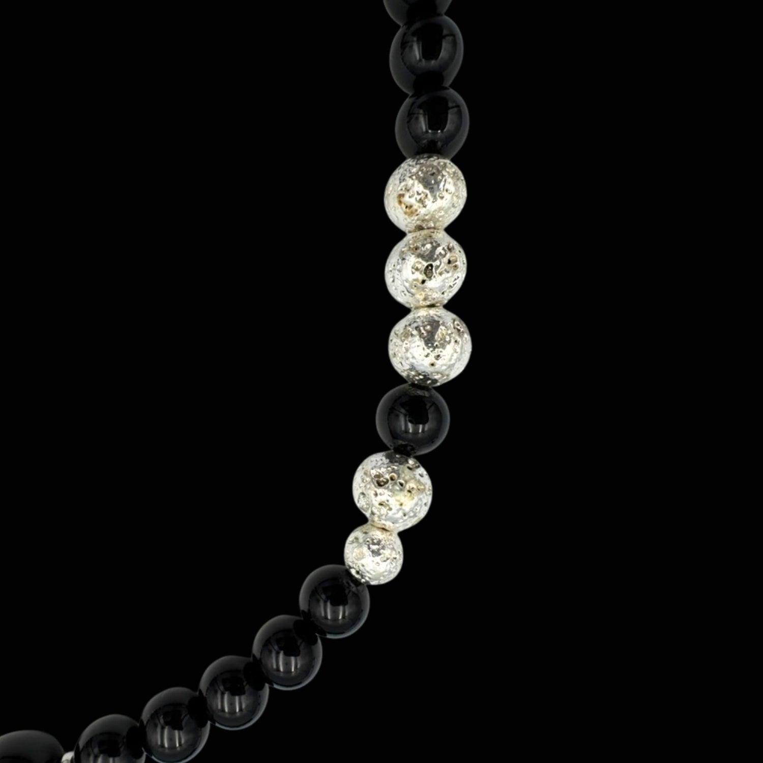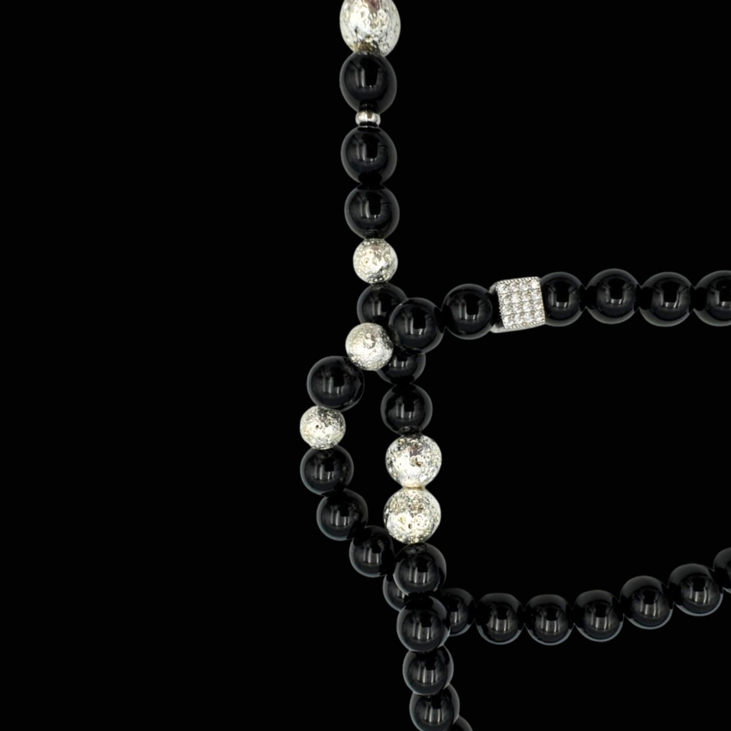 Onixul prezent în colier asigură protecție, rezistență și echilibru emoțional. Este cunoscut pentru rolul lui de a absorbi energiile ostile și de a stabiliza starea interioară în perioade tensionate. Susține concentrarea, disciplina și încrederea în sine.