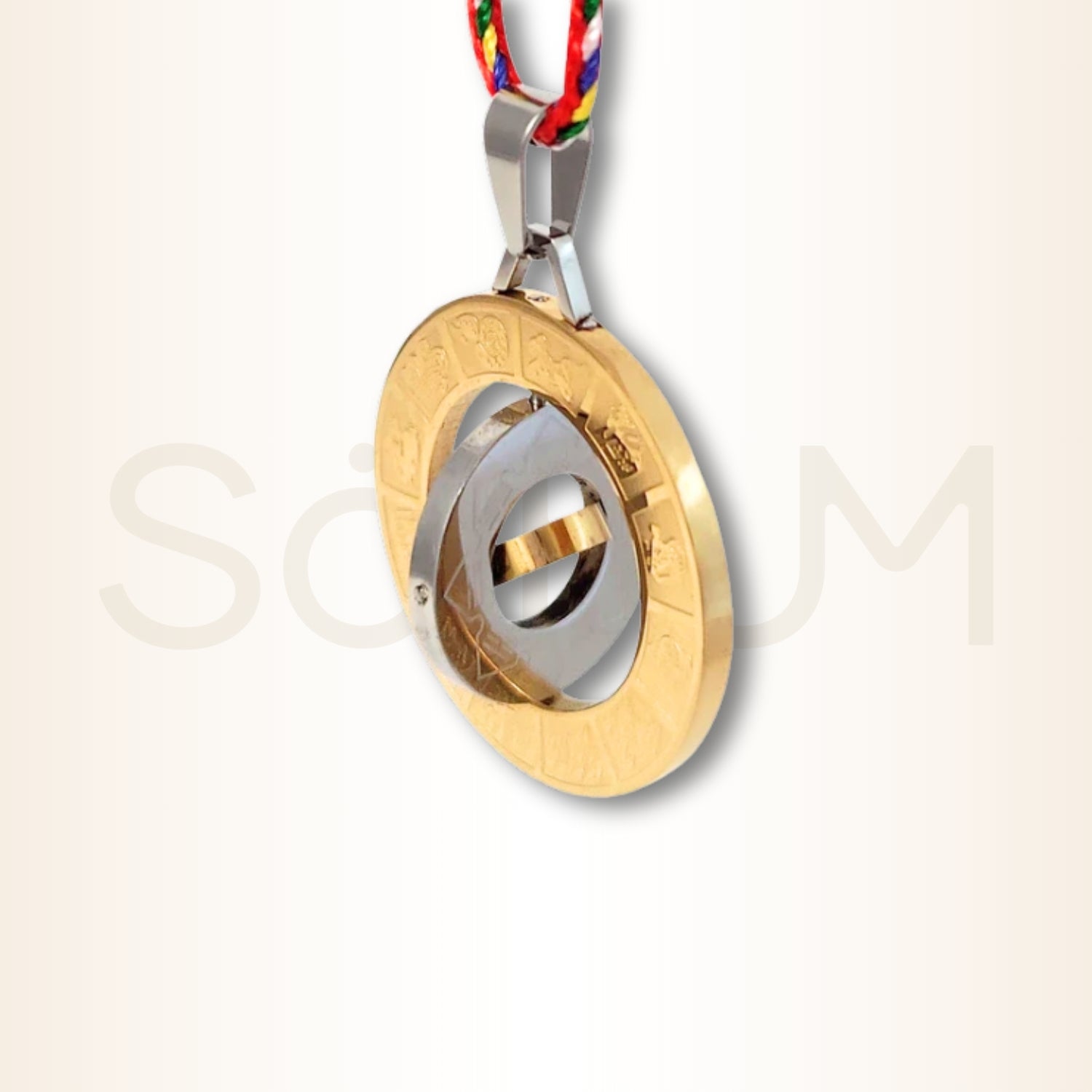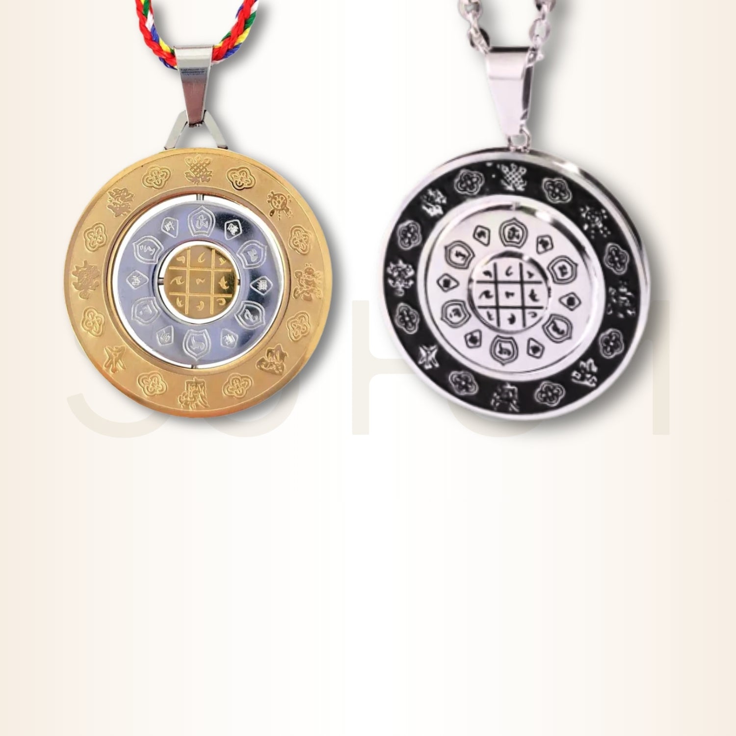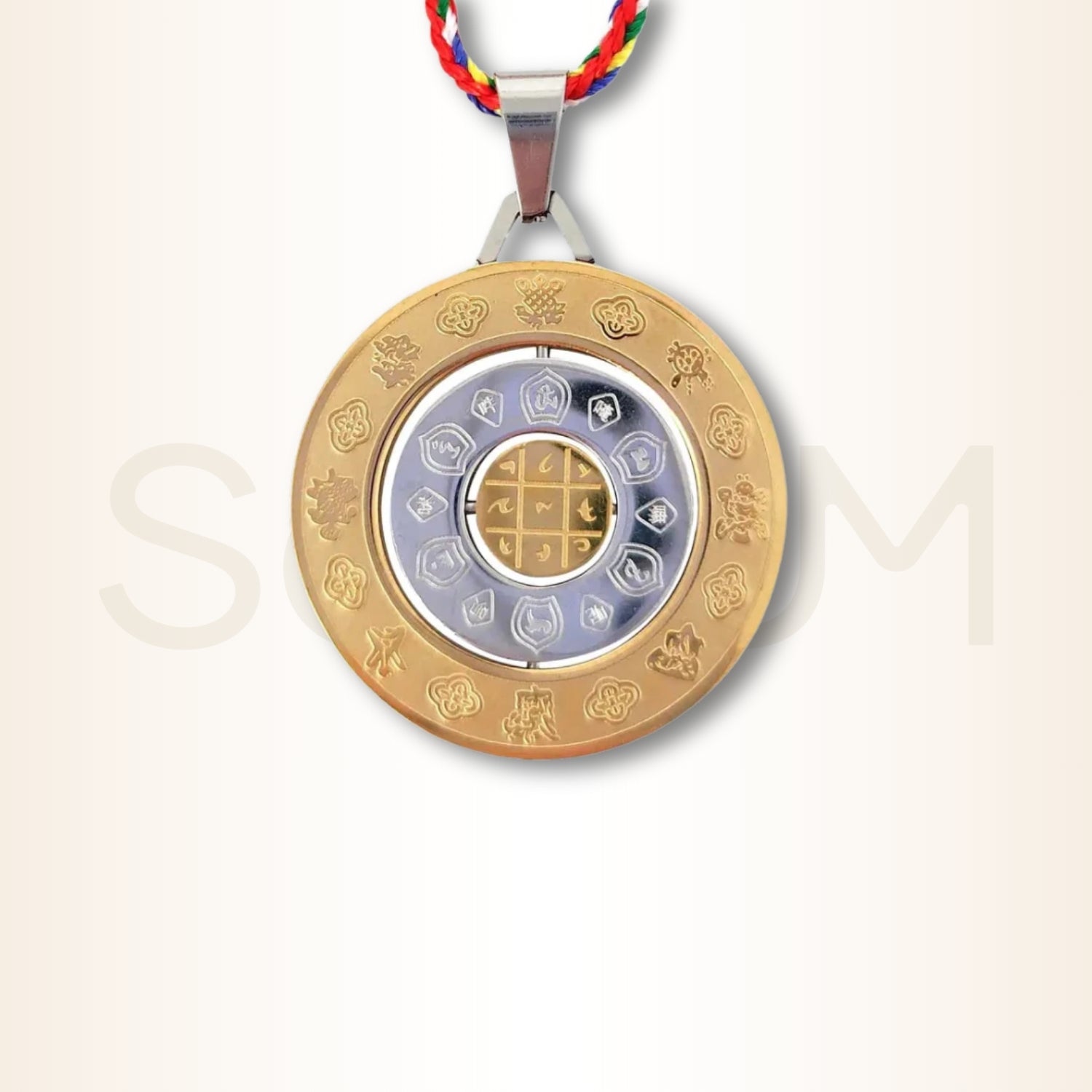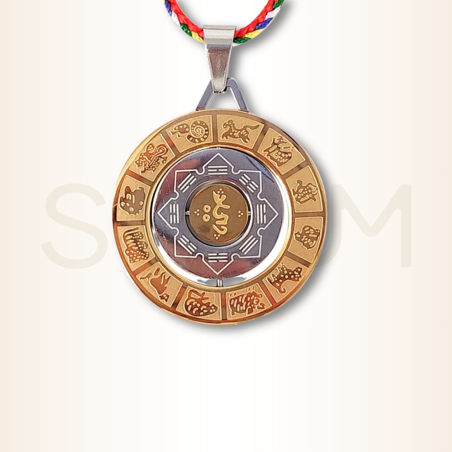 Acest medalion elegant este un accesoriu puternic și protector, creat pentru a aduce noroc, armonie și protecție Divină. Pandantivul are două fețe: pe una se află silaba sacră HRIH încadrată într-o trigramă I Ching și înconjurată de cele 12 zodii chinezești, iar pe cealaltă parte este gravată mantra OM MANI PADME HUM, înconjurată de cele 8 simboluri de bun augur tibetane. Medalionul este prins pe un șnur textil rezistent, multicolor, pentru un plus de stil și energie de bun augur.