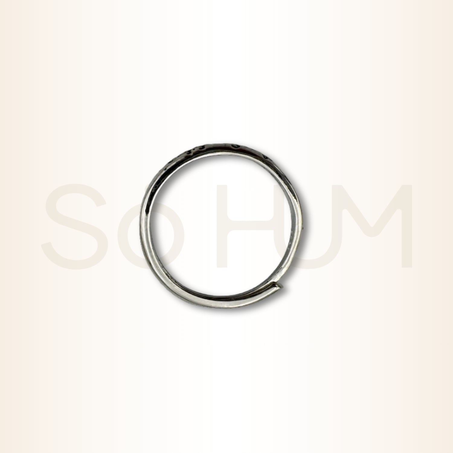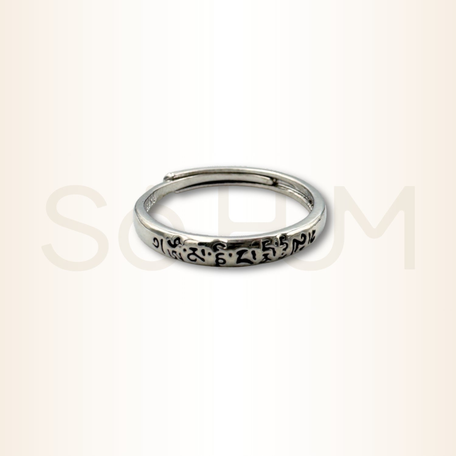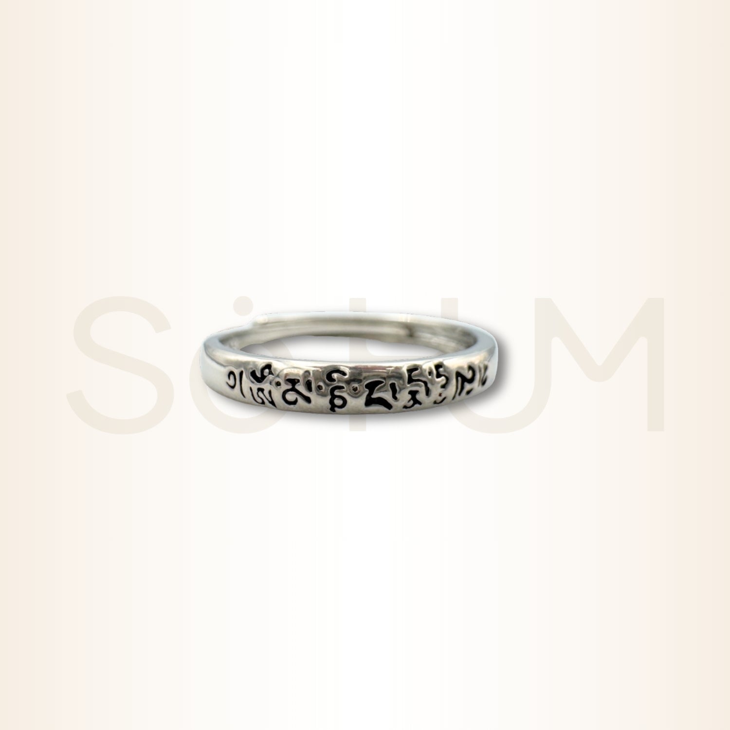 Acest inel poartă inscripția Om Mani Padme Hum, una dintre cele mai recunoscute mantre din tradiția budistă, asociată cu Bodhisattva Avalokiteshvara, simbol al compasiunii universale. Mantra este folosită pentru purificare, protecție energetică și deschiderea inimii, fiind considerată o formulă sacră care aduce claritate interioară și transformare blândă.