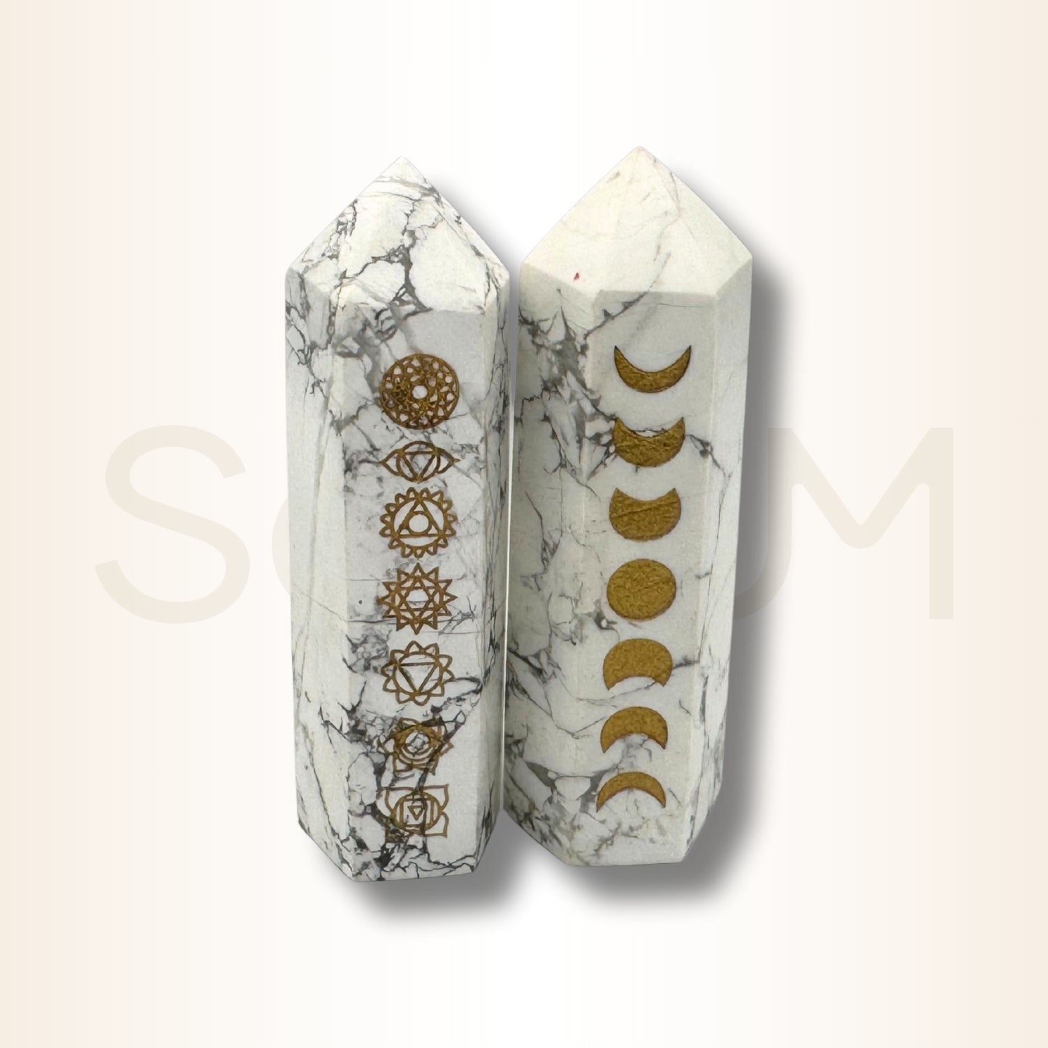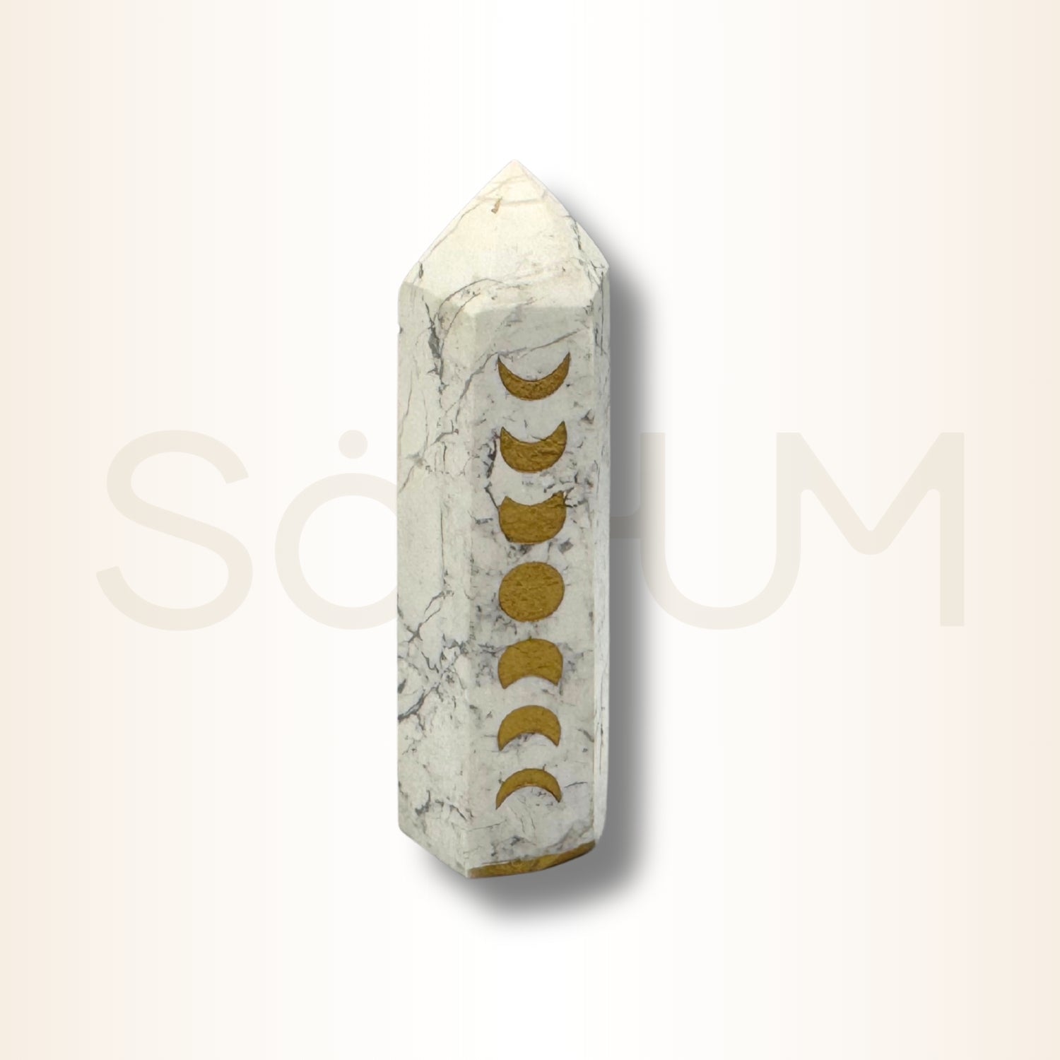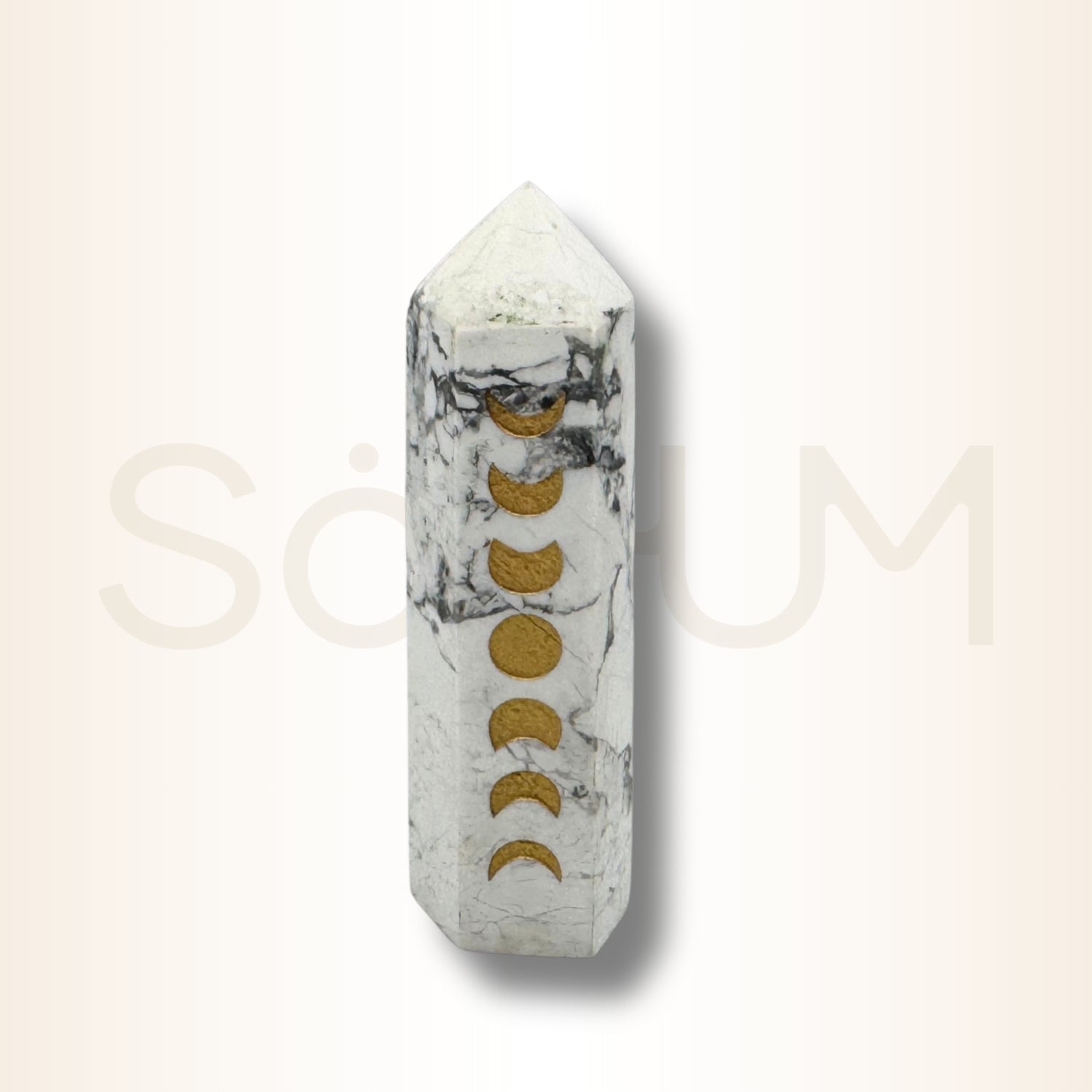 Obeliscul din Howlit alb gravat cu fazele Lunii aduce în centru simbolistica ciclurilor de transformare. Fiecare fază a Lunii marchează etape diferite de evoluție, înnoire și eliberare, iar asocierea cu Howlitul creează un obiect potrivit pentru perioade de tranziție, începuturi, încheieri și setarea unor intenții noi. Energia Lunii se completează armonios cu vibrația calmantă a Howlitului, facilitând introspecția și claritatea asupra etapelor prin care se trece.