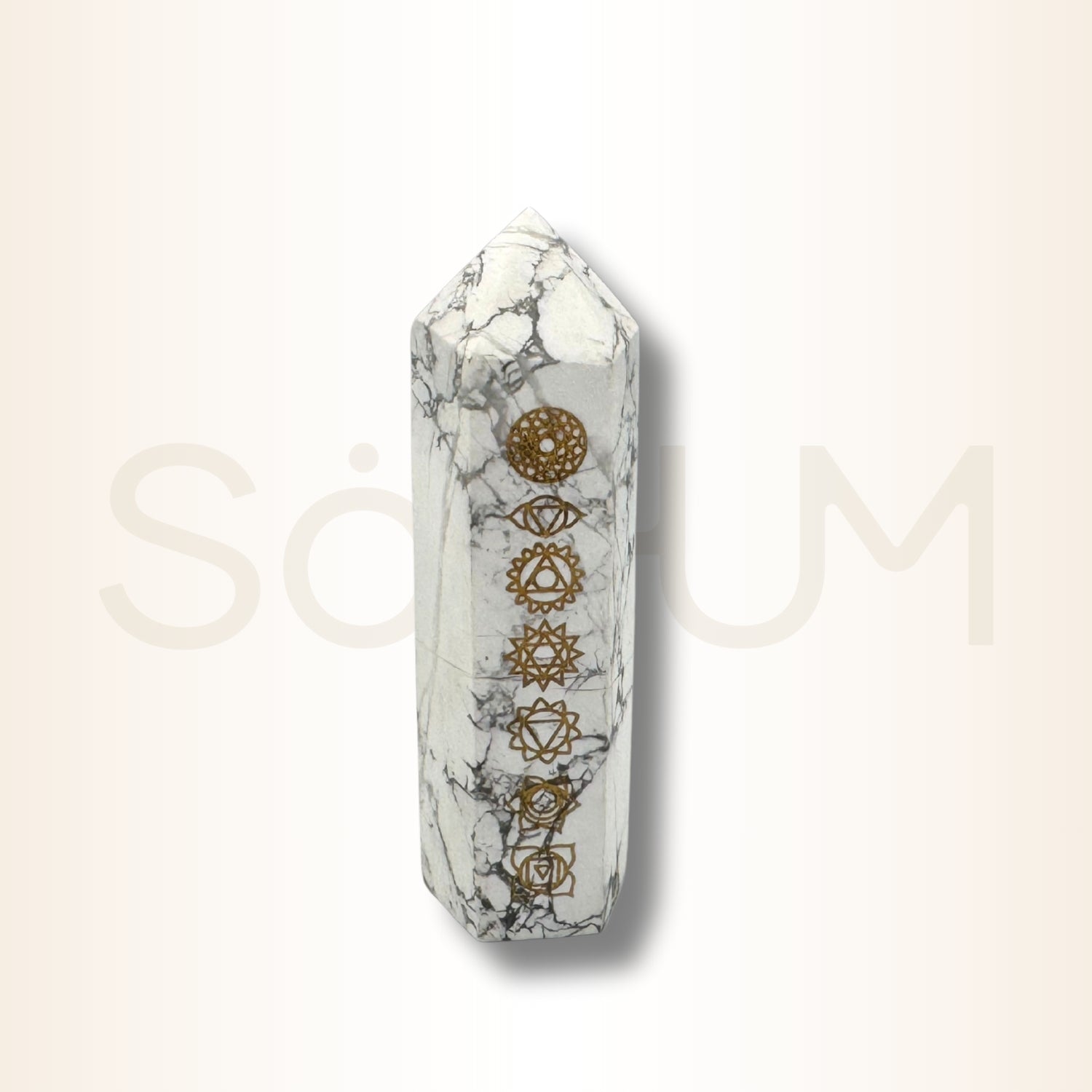 Obeliscul din Howlit alb gravat cu cele 7 chakre susține armonizarea întregului sistem energetic. Fiecare simbol este asociat unui centru care influențează vitalitatea, emoțiile, comunicarea, intuiția și direcția personală. Gravura pe Howlit amplifică senzația de ordine și echilibru, fiind un obiect potrivit pentru lucrul cu blocajele energetice, pentru meditații dedicate realinierii și pentru spațiile de practică spirituală sau terapeutică.