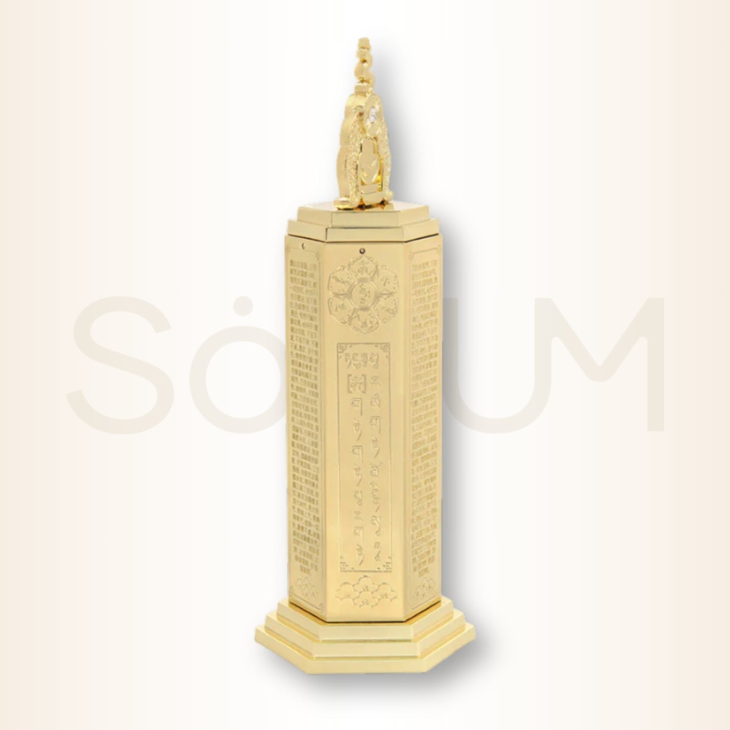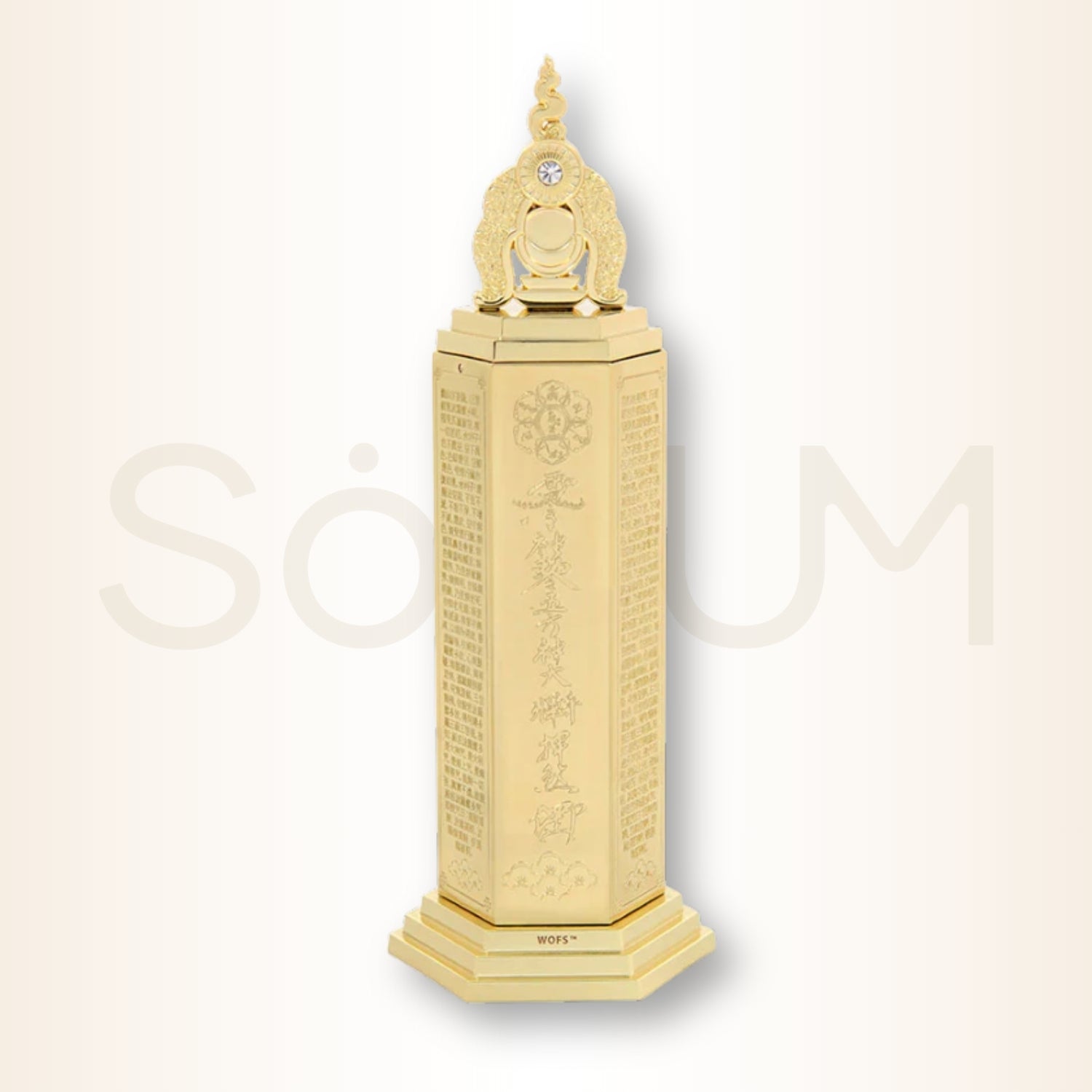 Forma de stâlp hexagonal susține o structură simbolică puternică. Suprafața pagodei este gravată cu Talismanul celor Cinci Galbeni, cu mantra Sutrei Inimii pe fiecare coloană și cu simbolul sacru Om Mani Padme Hum, elemente care acționează simultan pentru dizolvarea obstacolelor, curățarea karmei negative și protecția împotriva pierderilor, îmbolnăvirilor și nenorocirilor.