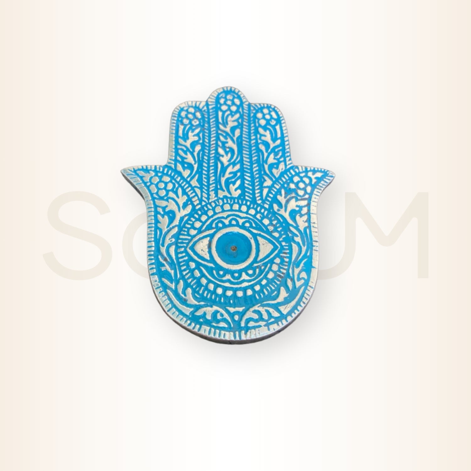 Florile și arabescurile gravate completează simbolistica Hamsa, reprezentând curgerea vieții, regenerarea și purificarea permanentă. Fie că alegi varianta argintie pentru neutralitate și rafinament, aurie pentru energie solară și putere, sau argintie cu turcoaz pentru calm emoțional și echilibru, acest suport devine un obiect esențial în orice ritual de fumigație. Este o piesă care unește estetica cu funcționalitatea și susține constant intențiile tale de protecție și claritate.